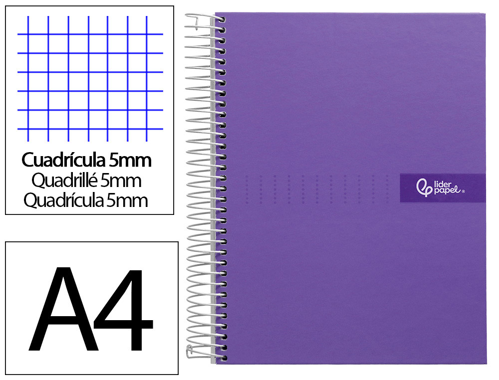 Cuaderno espiral liderpapel a4 micro crafty tapa forrada 120h 90gr cuadro 5mm 5 bandas 4 taladros color violeta