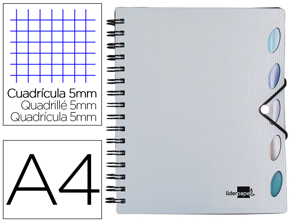 Tapa de polipropileno de 1650 micras de espesor extra-resistente metalizada. 100 hojas. Papel de 80 g/m². Cuadrícula de 5 mm. Microperforado. Doble espiral nylonizada color negro. 5 separadores intercambiables. 5 índices de color. Cierre de gomilla con elástico y sujeción metálica.