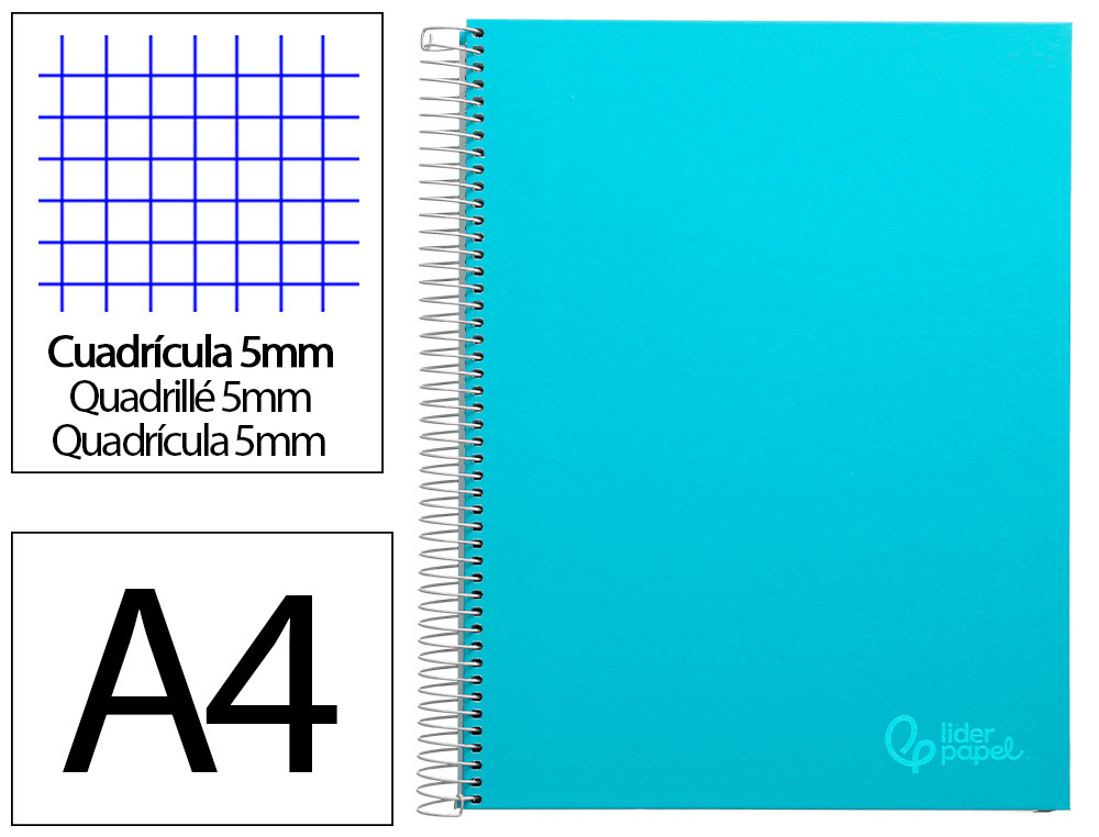 Cuaderno espiral liderpapel a4 micro jolly tapa forrada 140h 75gr cuadro 5mm 5 bandas 4 taladros color celeste