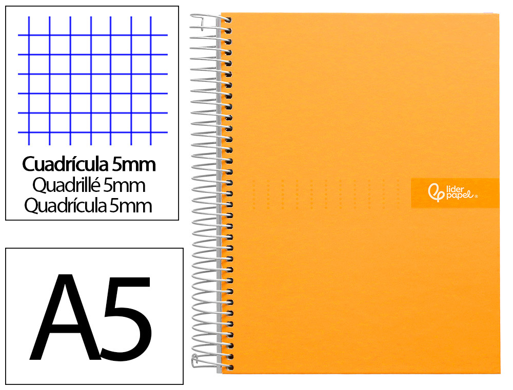 Cuaderno espiral liderpapel a5 micro crafty tapa forrada 120h 90gr cuadro 5mm 5 bandas 6 taladros color naranja