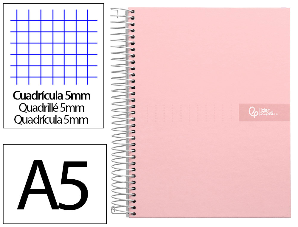 Cuaderno espiral liderpapel a5 micro crafty tapa forrada 120h 90gr cuadro 5mm 5 bandas 6 taladros color rosa