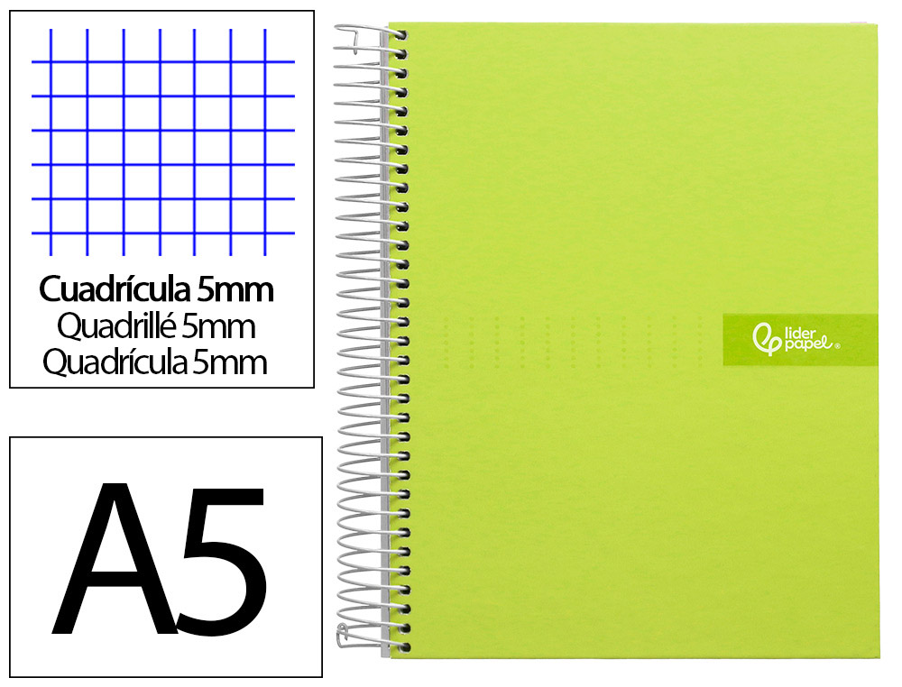 Cuaderno espiral liderpapel a5 micro crafty tapa forrada 120h 90gr cuadro 5mm 5 bandas 6 taladros color verde