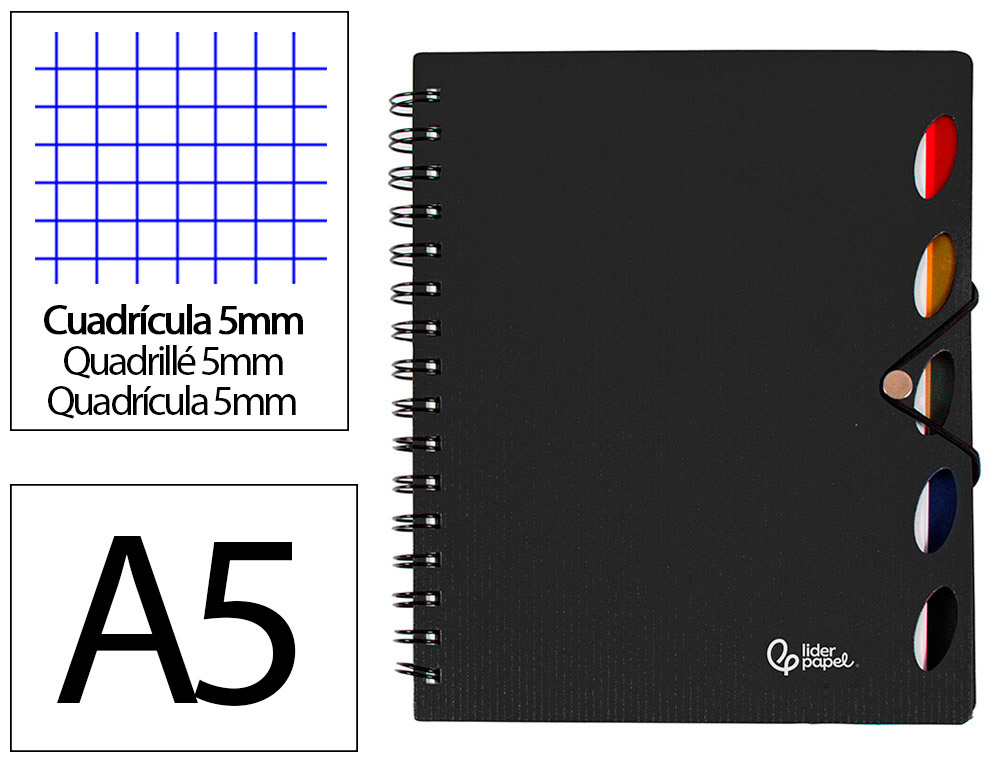 Tapa de polipropileno de 1650 micras de espesor extrarresistente metalizada. 100 hojas. Papel de 80 g/m². Cuadrícula de 5 mm. Microperforado. Doble espiral nylonizada color negro. 5 separadores intercambiables. 5 índices de color. Cierre de gomilla con elástico y sujeción metálica.