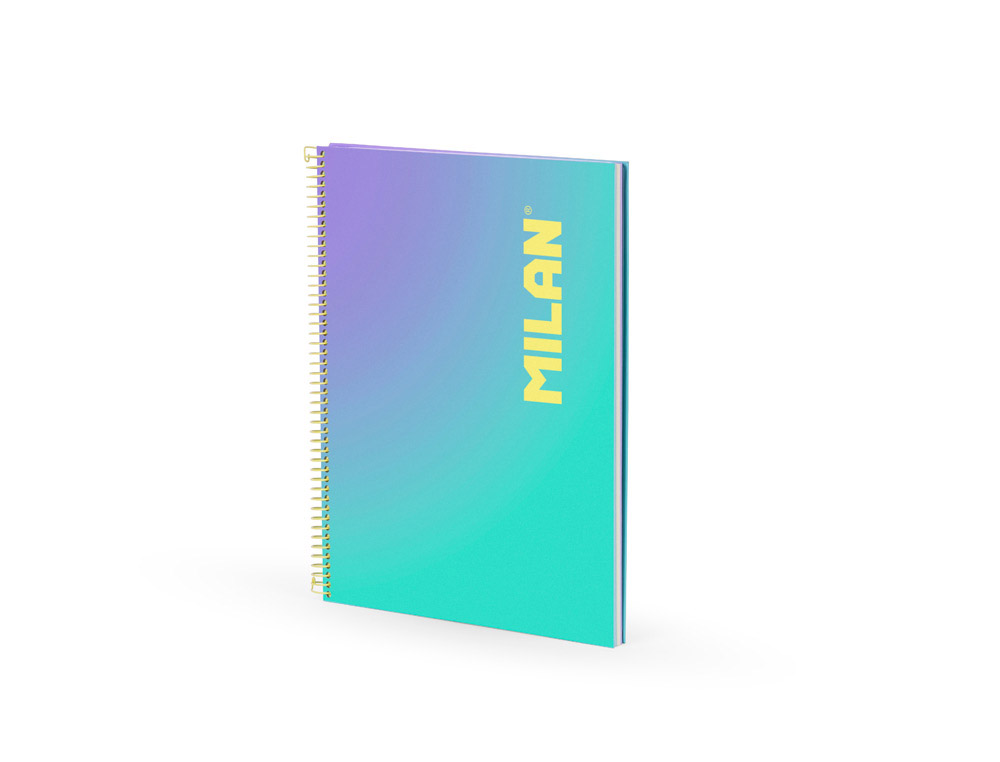 Cuaderno A4 con espiral metálica y tapa dura. 90 hojas de papel cuadriculado (5 x 5 mm) con 3 bandas de colores (30 hojas por color). Papel de 95 gr/m² de alta calidad, microperforado y con 4 taladros. Iniciador de corte para facilitar la separación de cada hoja. Cubierta de cartón rígido y logotipo MILAN brillante en relieve. Espiral flexible con cierre de seguridad que evita enganches con la ropa o rayaduras en muebles. Color turquesa. Colección Sunset: una combinación de colores degradados inspirados en el atardecer mediterráneo, acompañados de detalles en blanco y negro. Medidas: 29,5 x 24 x 2 cm.