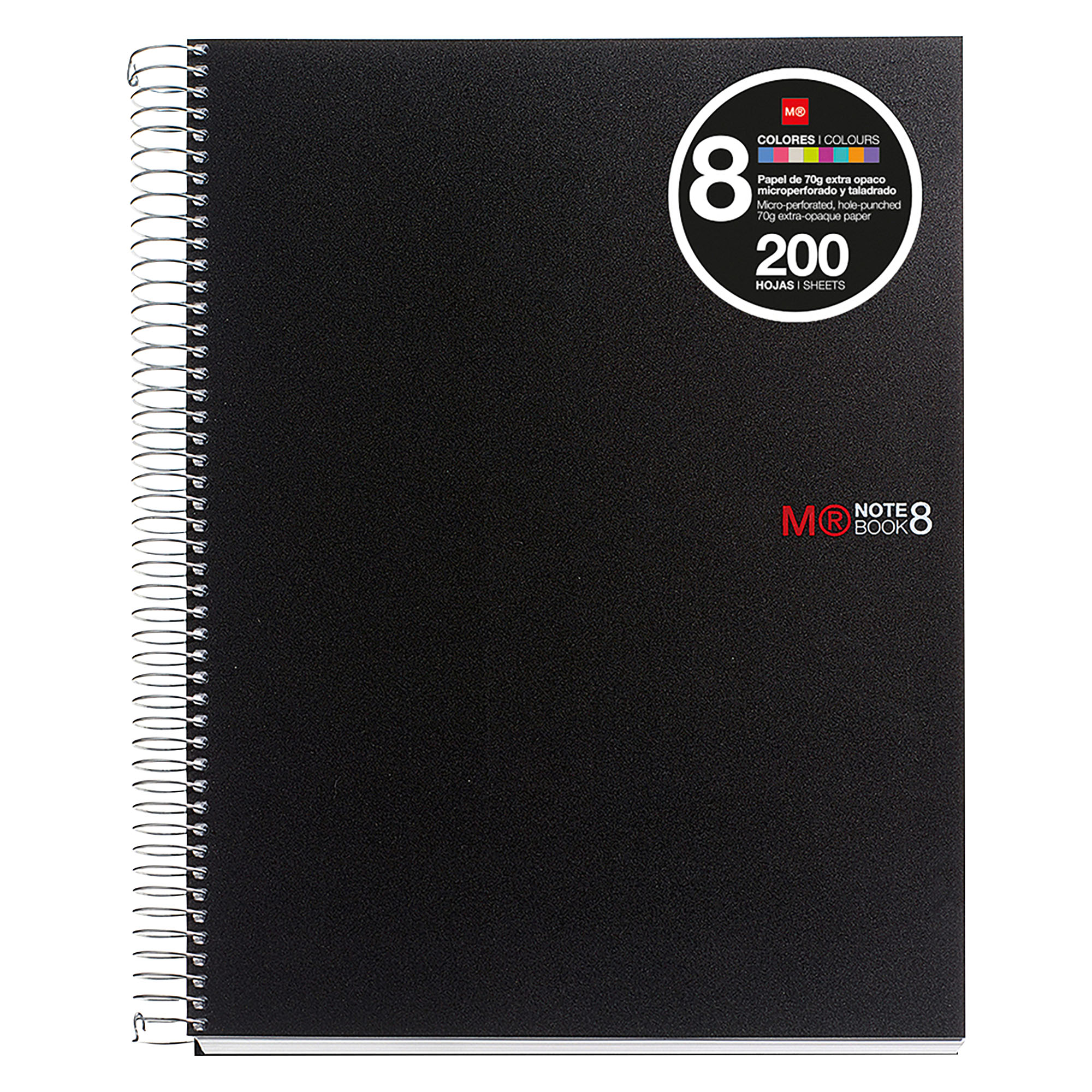 Libreta de espiral y tapa de polipropileno. Contiene 200 hojas microperforadas y con taladros para su archivo. Dispone de 8 bandas de colores disitintos. (25 hojas por color) Tamaño A4.