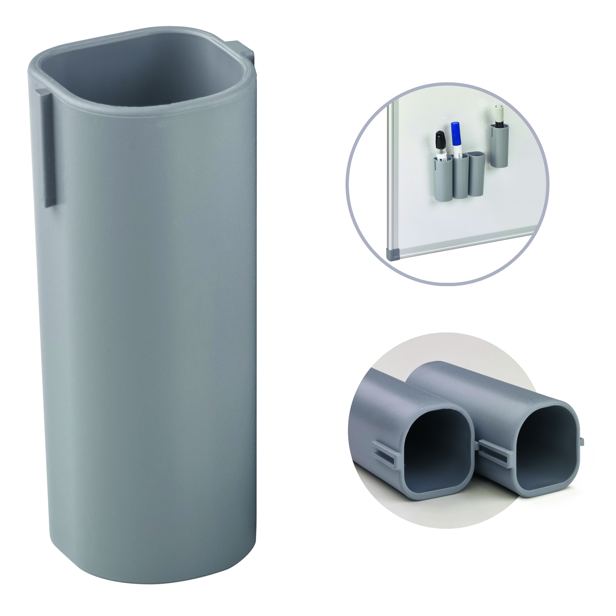 Cubilete, magnético para rotuladores. Perfecto para pizarra magnética o cualquier superficie metálica. En casa o en la oficina siempre los tendrás localizados. Diseñado para poder utilizarse de forma individual, o formando bloques para tener a nuestra disposición cuantos elementos de escritura deseemos, basta con unir con un simple desplazamiento la parte derecha con la izquierda. Color gris.