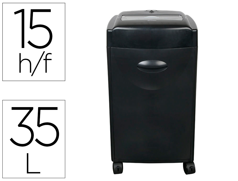 Capacidad de corte: 15 hojas. Corte en partículas de 4 x 30 mm. Ancho de entrada: 225 mm. Nivel de seguridad P-4. Arranque y parada automáticos. Marcha atrás para eliminar atascos. Protección contra sobrecalentamiento. Destruye grapas, clips y tarjetas de crédito y CD. Papelera de 35 litros. Medidas: 381 x 653 x 325 mm. Peso: 14,7 kg.
