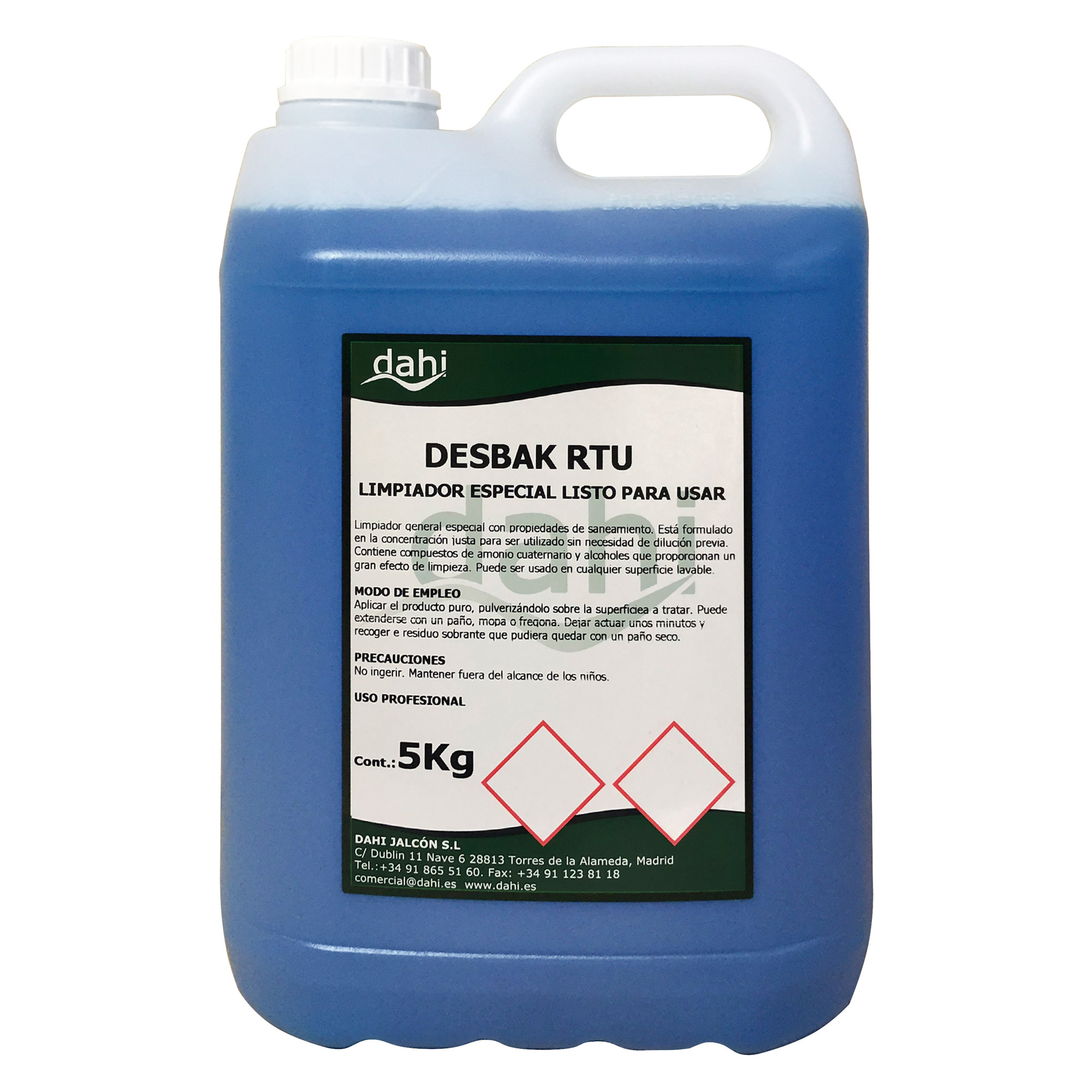 Desbak contiene amonio cuaternario para unir al efecto detergente y desodorizante un efecto higienizante. Está especialmente indicado para la limpieza general de hospitales, colegios, residencias de ancianos, gimnasios ... dónde se requiera una limpieza higienizante con efecto residual.