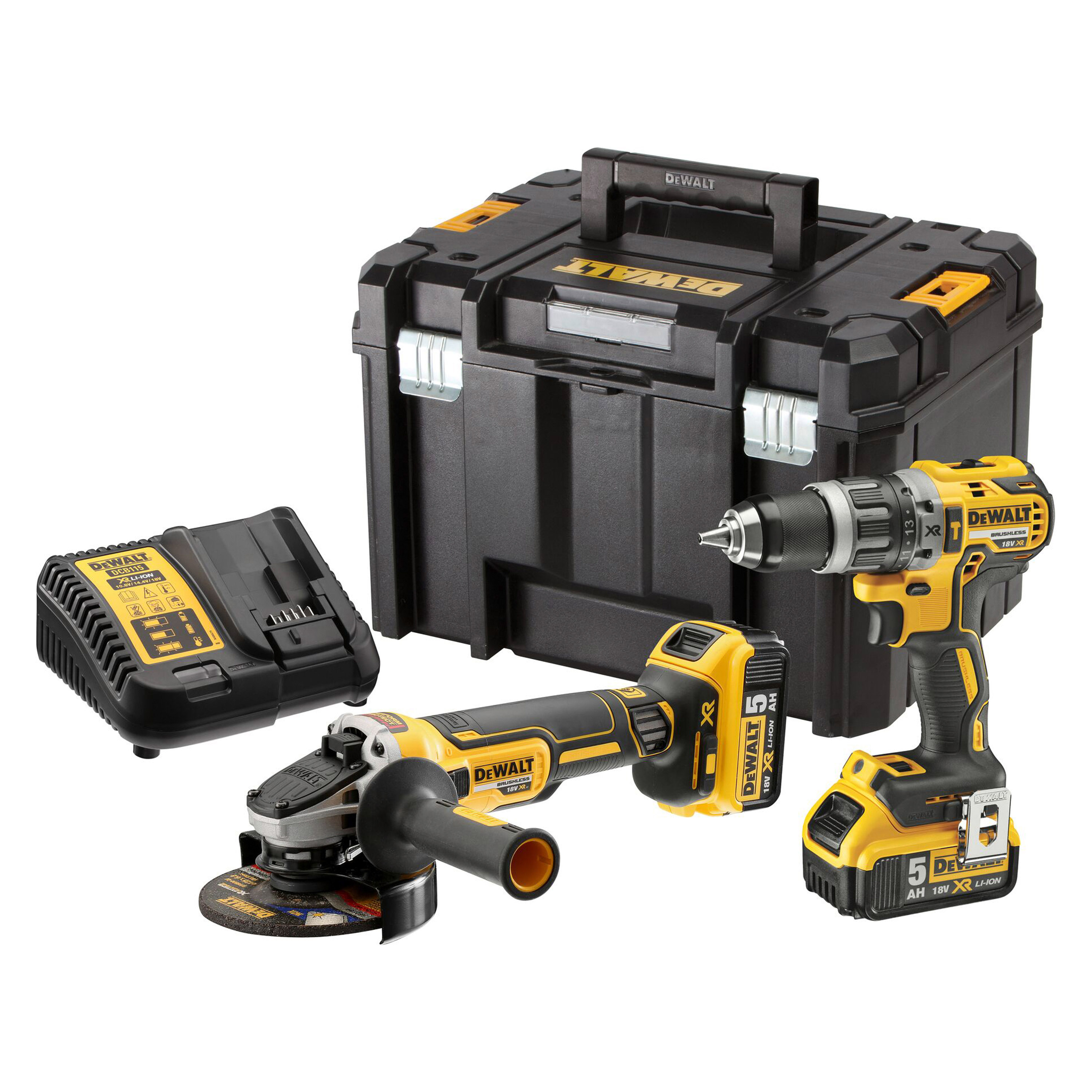 El kit incluye: Taladro percutor compacto sin escobillas de 18 V, atornillador angular sin escobillas, 2 baterías de 5.0 Ah, cargador multivoltaje y caja de kit TSTAK VI.