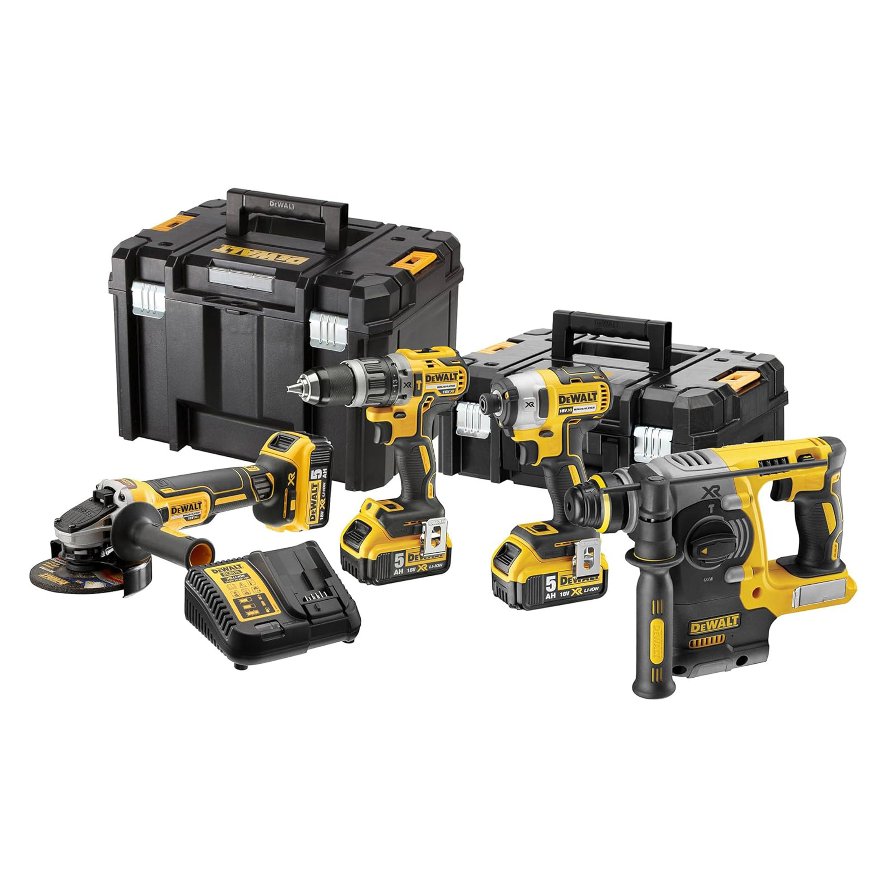 El Kit de 4 Herramientas XR 18V incluye un martillo electroneumático DCH273 diseñado para perforaciones intensivas en concreto y mampostería, una amoladora, un taladro percutor compacto, adecuado para una variedad de aplicaciones de perforación y atornillado, y un atornillador de impacto que ofrece alto torque para atornillar tornillos y pernos con facilidad.