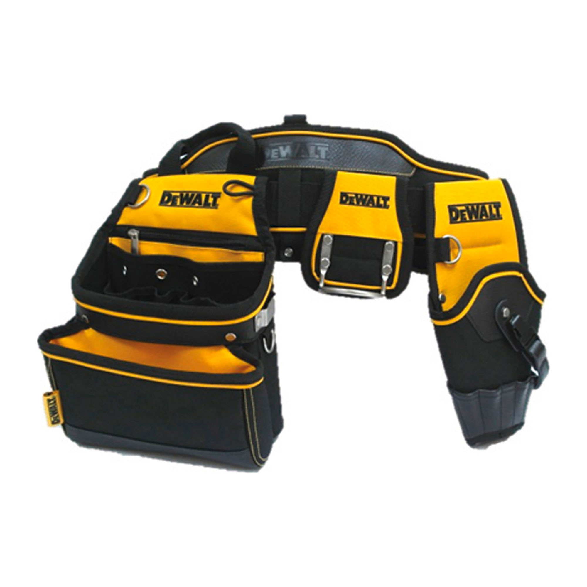 acolchado, con malla transpirable, de 120x390mm con bolsa multi-usos, anillo porta-martillo, funda para taladro y clip porta-flex-ometro de metal. Totalmente ajustable para adaptarse a todas las tallas de cintura. Con base de PVC que protege contra el desgaste.