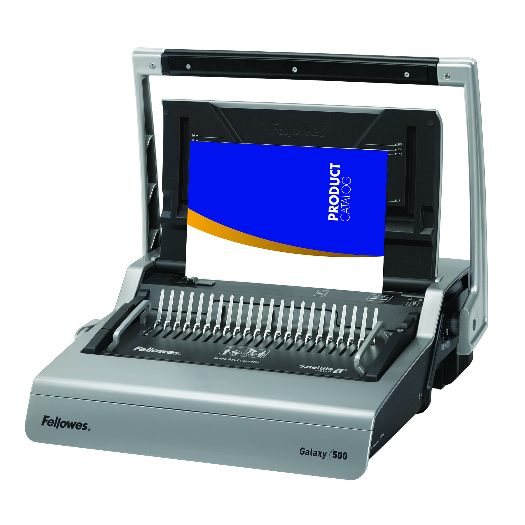 La encuadernadora eléctrica Galaxy-E 500 es ideal para un uso intenso en oficina de alto rendimiento, ya que puede encuadernar hasta 500 hojas. Es fácil de utilizar y cuenta con características que permiten dar a cualquier documento un acabado profesional. Es una máquina esencial en una oficina de alto rendimiento, que permite perforar hasta 28 hojas de manera automática. Su Sistema Satélite permite perforar y encuadernar de manera simultánea, lo que significa que permite separar el bloque de encuadernación del bloque de perforación, facilitando el realizar el trabajo por varios usuarios a la vez y obteniendo así la máxima productividad.