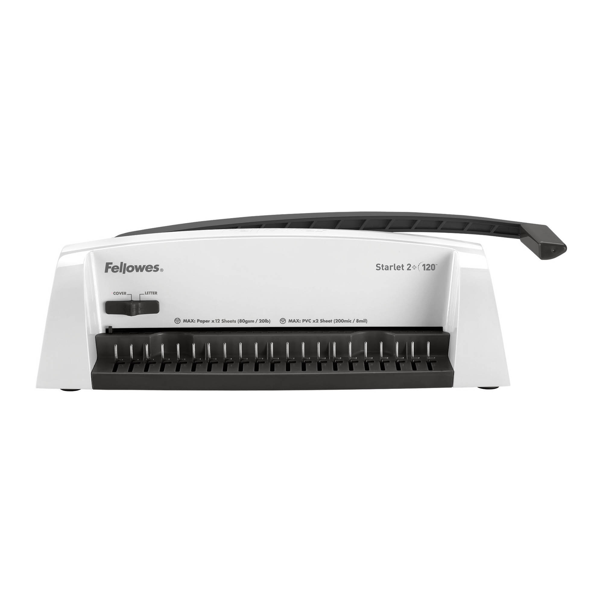 Encuadernadora para canutillo de plástico. Perfora hasta 12 hojas de 80 gr. Encuaderna hasta 120 hojas. Margen lateral para alinear los documentos con precisión. Para encuadernar formatos A4 o A5. Bandeja para residuos. Dimensiones: 485 x 195 130 mm. Peso 3,3 kg.