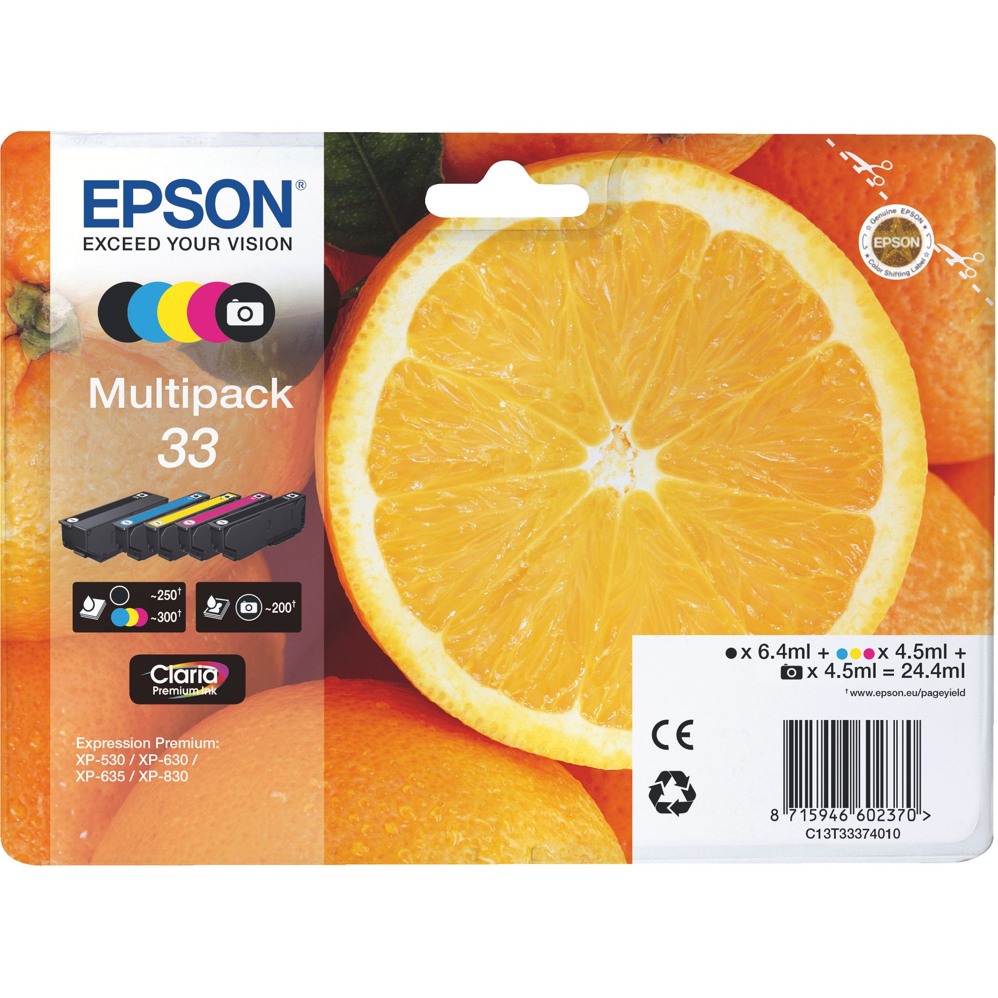Cartuchos con las mismas compatibilidadesEpson 33 Pack 5 cartuchos originales Negro + negro foto + tricolor (250 + 200 + 3 x 200 páginas)3 opiniones76,99 € sin IVAEpson 33XL cartucho original colores separados alta capacidad2 opinionesdesde22,49 € sin IVAEpson Oranges Singlepack Yellow 33 Claria Premium Inkdesde16,95 € sin IVAEpson 33XL Pack cartuchos originales alta capacidad (negro + negro foto + 3 colroes)5 opiniones122 € sin IVAEpson 33XL cartucho original negro alta capacidad3 opinionesdesde27,99 € sin IVA