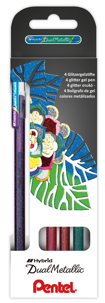 Estuche de 4 unidades. Bolígrafo Dual Metallic de tinta de gel de dos colores metálicos diferentes que cambian dependiendo si pintas sobre papel blanco o negro. 4 colores metálicos brillantes de tinta gel (Naranja/Amarillo, Violeta/Azul, Rosa/Rosa y Verde/Azul. Cuerpo de plástico transparente.