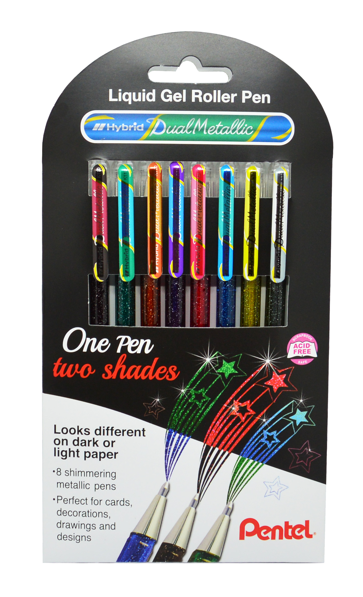 Estuche de 8 unidades. Bolígrafo Dual Metallic de tinta de gel de dos colores metálicos diferentes que cambian dependiendo si pintas sobre papel blanco o negro. 8 colores metálicos brillantes de tinta gel. Cuerpo de plástico transparente. Punta de bola de 1 mm y trazo de 0,4 mm (Negro/Rojo,Azul/Verde, Verde/Azul, Naranja/Amarillo, Rosa/Rosa, Violeta/Azul, Oro y Plata)