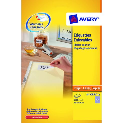 Elimina sin dejar rastro. Reposicionable varias veces durante la aplicación. Se aplica a una amplia variedad de superficies: vidrio, metal, plástico, respaldo, equipos electrónicos. Ideal para etiquetado de precios. esquinas redondeadasformato: L 17,8 x H 10 mm color blanco caja de 25 hojas con 270 etiquetas por hoja o 6750 etiquetas.