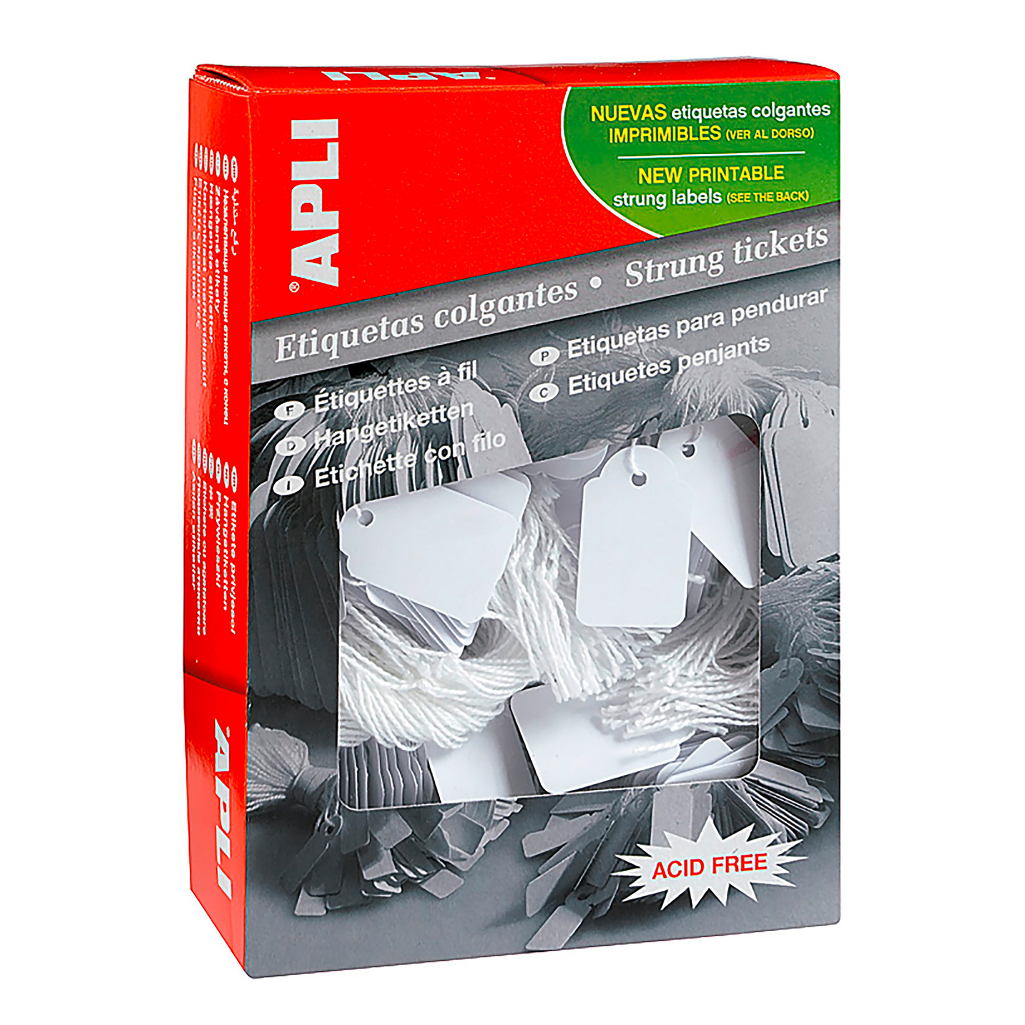 Descripción detalladaEtiquetas colgantes apli 392 36x53 mm caja de 500 unidades.Etiquetas rectangulares colgantes de cartulina en color blanco. Se suministran con cuerda para fijarlas al objeto deseado.
