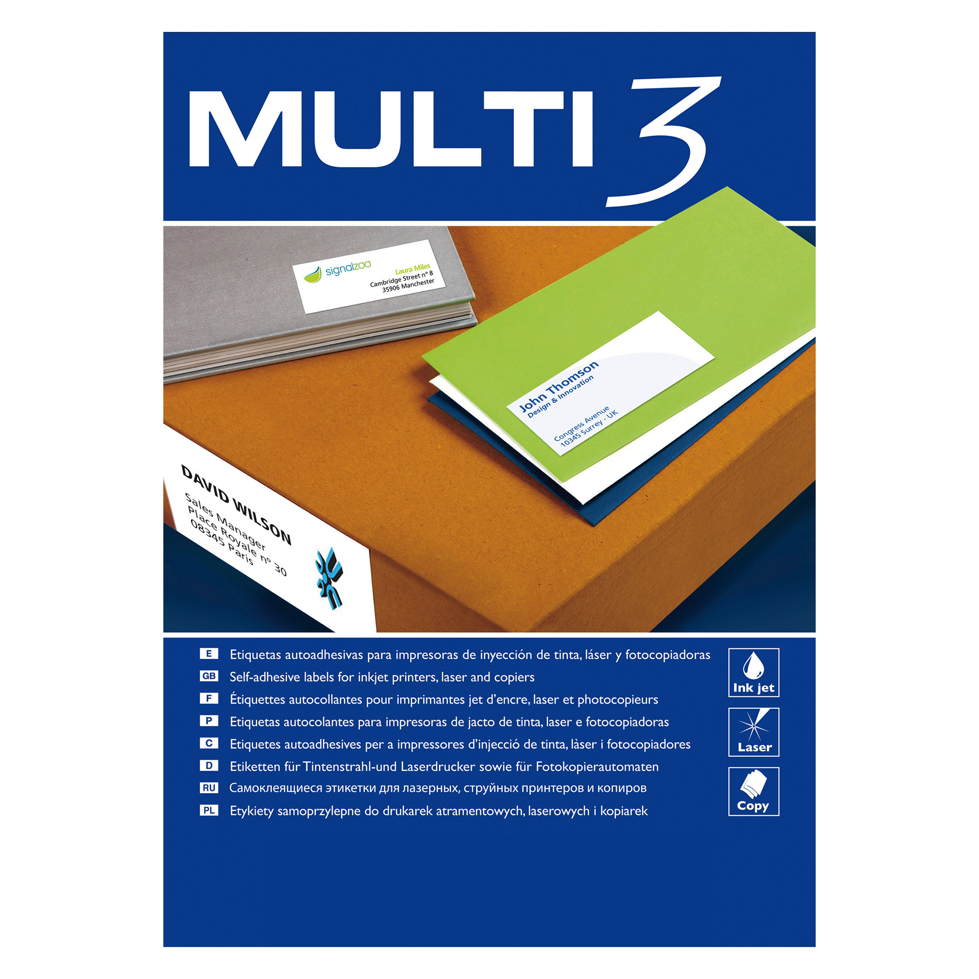 Descripción detalladaEtiquetas autoadhesivas para impresoras inkjet, láser y fotocopiadoras.Hojas A4. 51 etiquetas por hoja. Cantos rectos Paquete de 100 hojas.Referencia Multi3 4720.Contiene 5100 etiquetas.