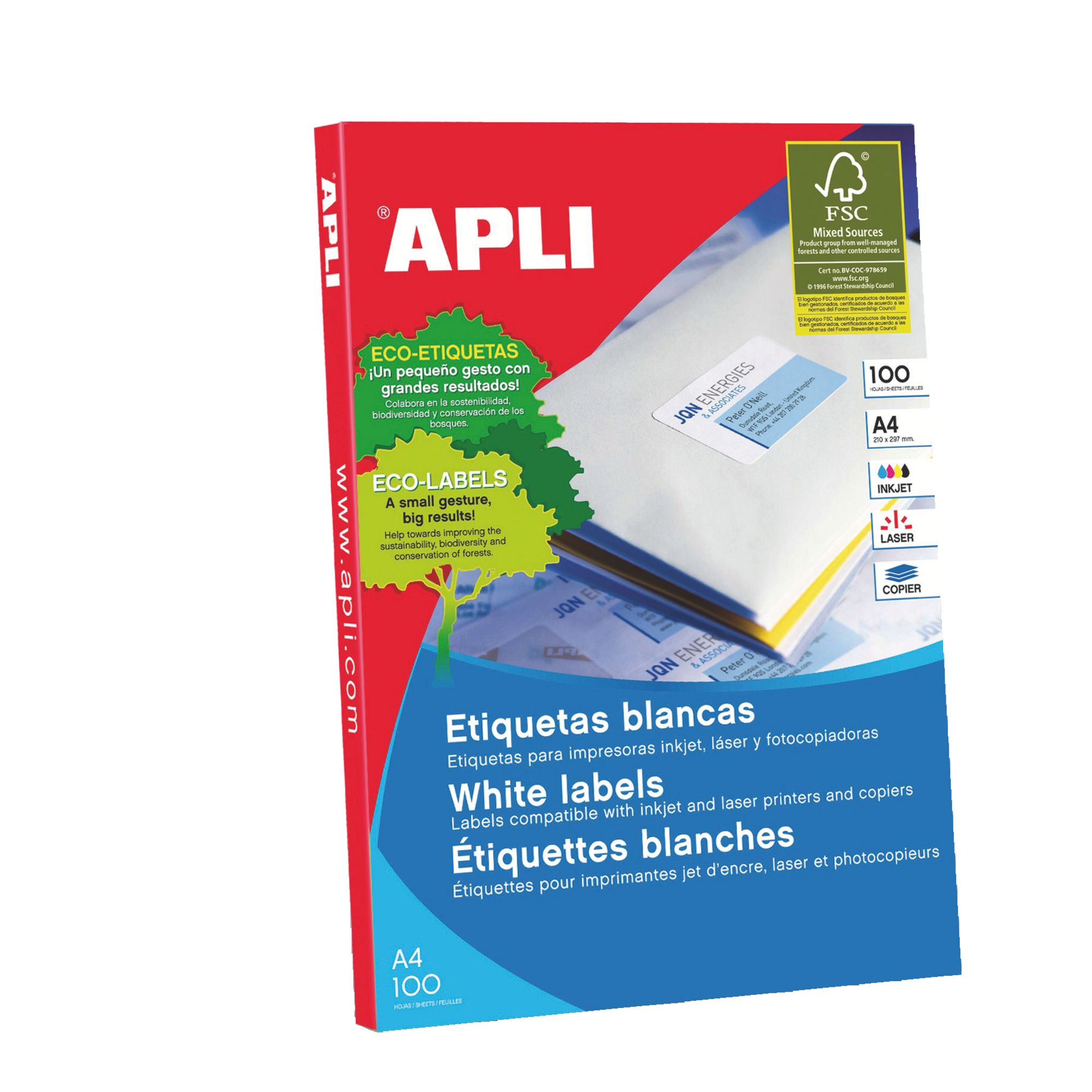 Descripción detalladaReferencia Apli 2422Formato A4, 4 etiquetas blancas autoadhesivas. Cajas de 100 hojas A4 (21 x 29,7 cm) Compatibles con los formatos de tratamiento de textos habituales (Word, Excel, Access etc.)Contiene 400 etiquetas.