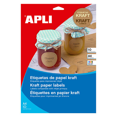 Descripción detalladaEtiquetas Kraft de tecnología inkjet.Paquete de 10 hojas A4, con 1 etiquetas por hoja.Medida etiqueta: 210 x 297 mm.