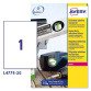 Dimensiones: 21 x 29,7 cm.  Color blanco, de  poliéster. Paquete de 20 hojas de 1 etiqueta, 20 etiquetas en total.