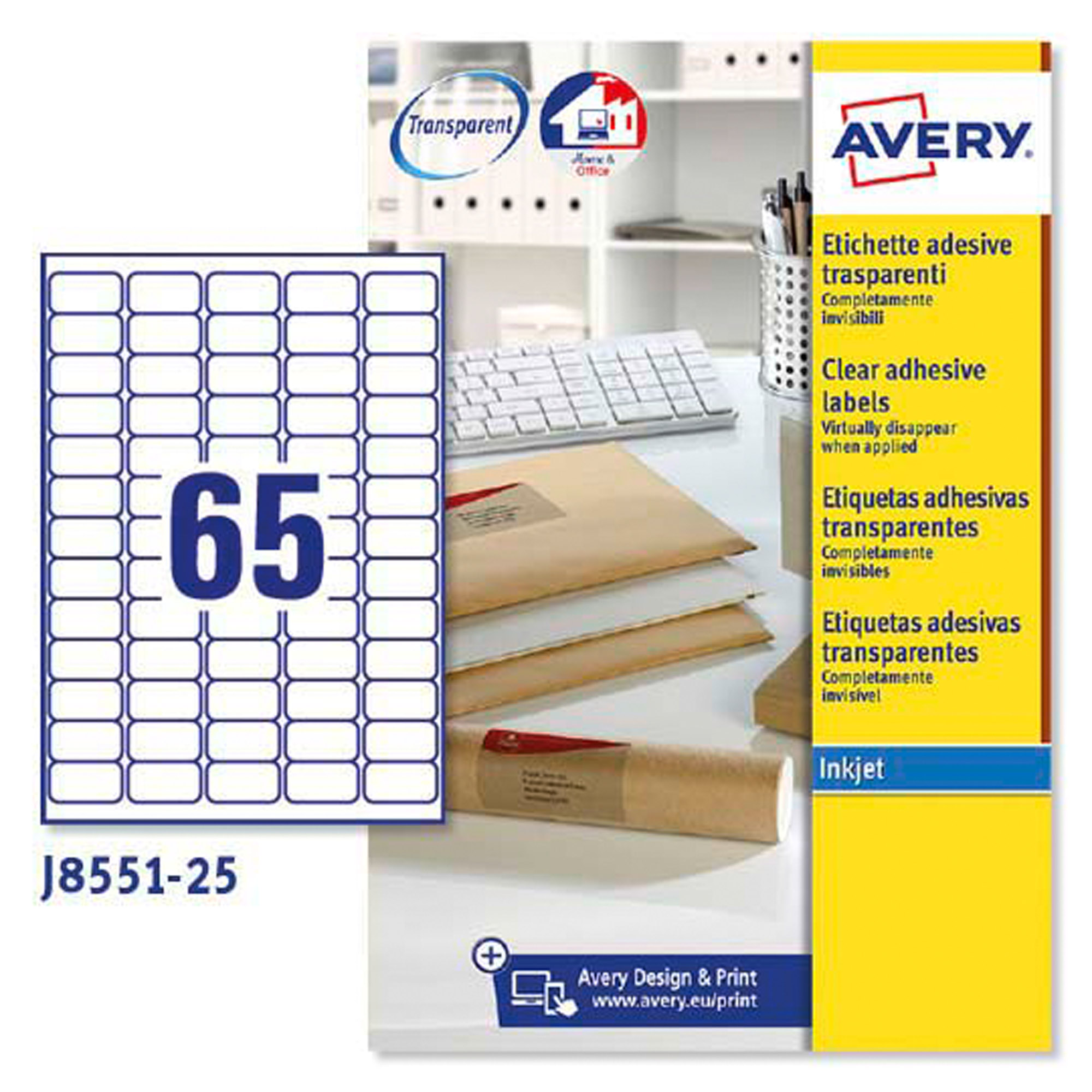 Fácil de imprimir y personalizar gracias a plantillas y software gratuitos en www.avery.com utilizando el código J8551. Para impresoras de inyección de tinta. Dimensiones: 38.1 x 21.2 mm. Color transparente de poliéster. Fácil de imprimir y personalizar gracias a plantillas y software gratuitos en www.avery.com utilizando el código J8551. Para impresoras de inyección de tinta. Cubierta de 25 hojas de 65 etiquetas o 1625 etiquetas en total.