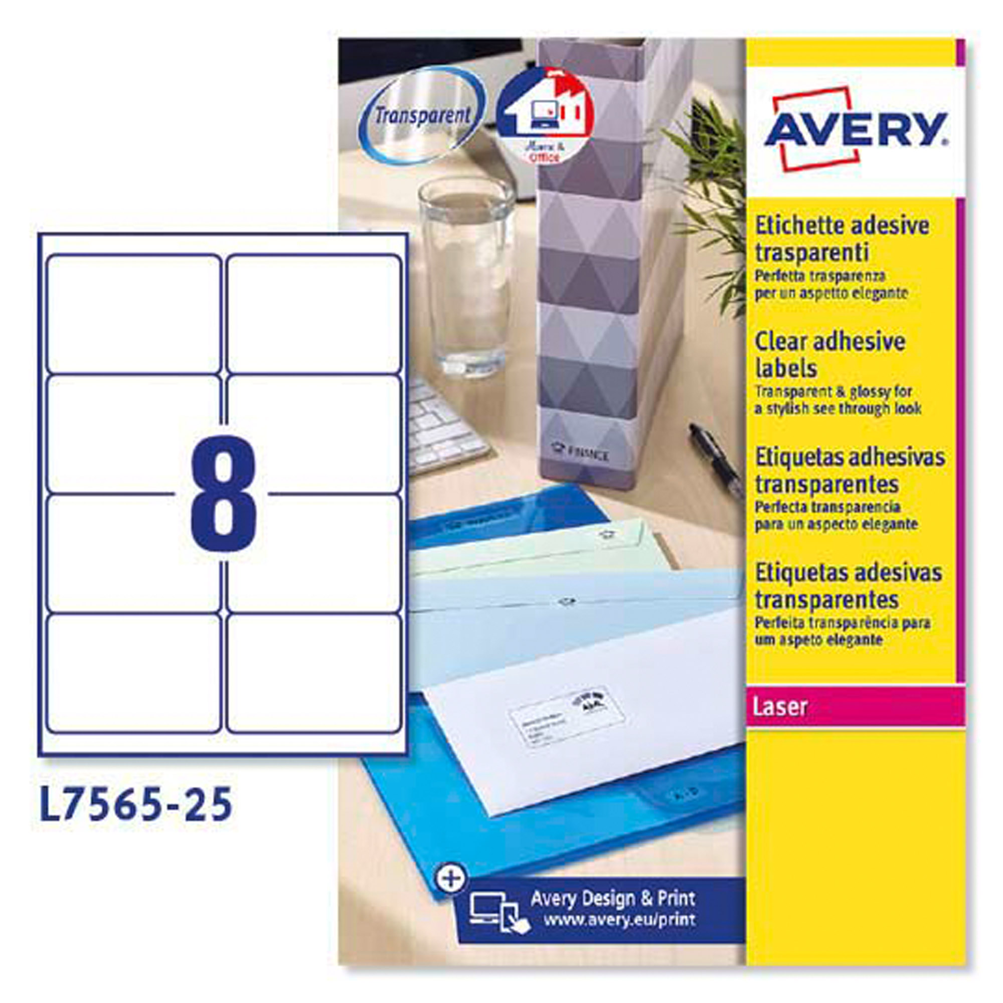 Dimensiones: 99.1 x 67.7 mm. Color transparente de poliéster. Paquete de 25 hojas de 8 etiquetas o 200 etiquetas en total.