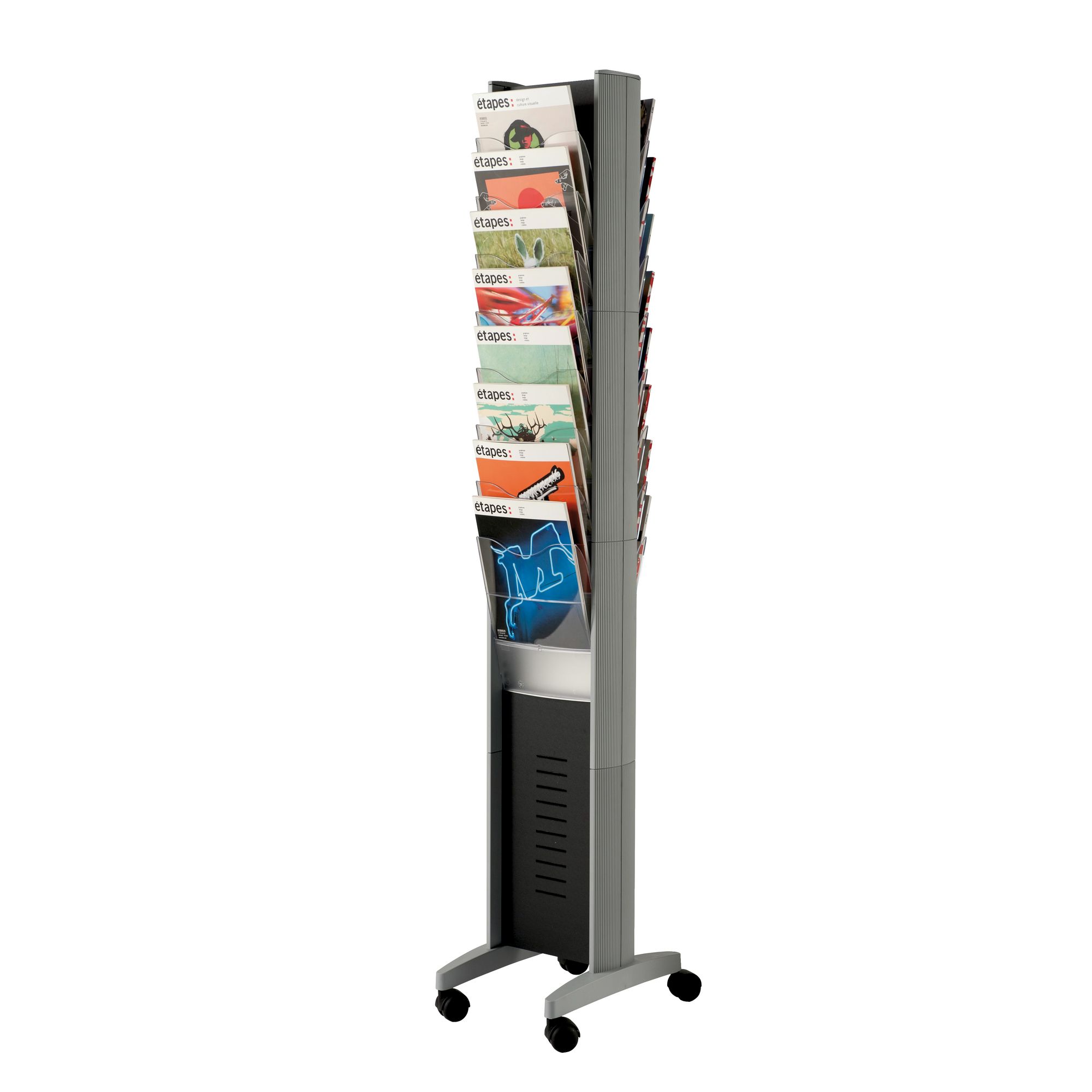 4 ruedas pivotantes. Montaje fácil y sin tornillos. Medidas totales: Alt. 167,5 x An. 30 x Fon. 38,5 cm. Color aluminio.