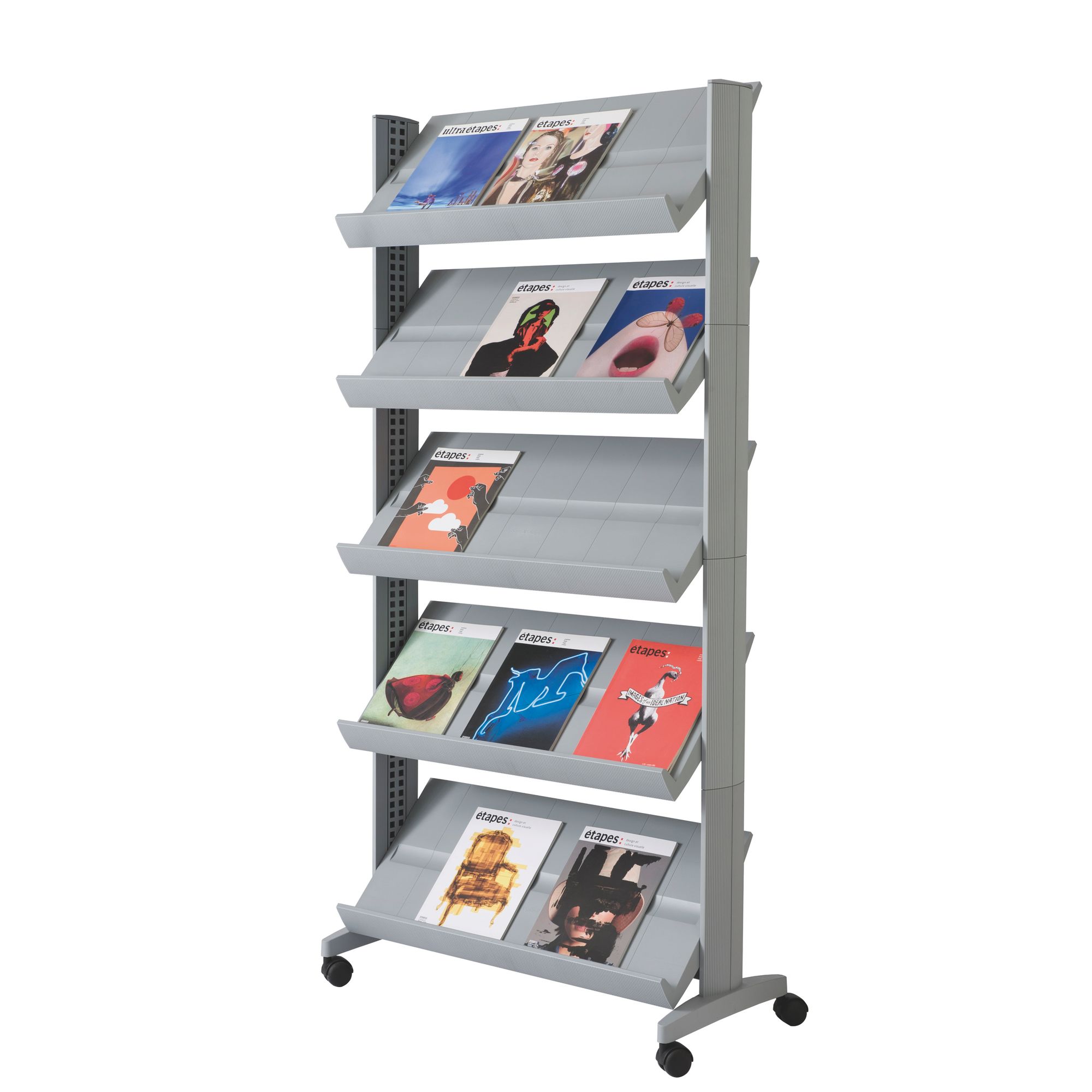 El expositor móvil Easy Display dispone de baldas regulables de amplia capacidad para exhibir folletos y catálogos en oficinas, salas de exposiciones o negocios comerciales. Su diseño funcional está hecho de una estructura metálica resistente perfilada de poliestireno para un acabado más limpio, es capaz de combinar en diferentes espacios.