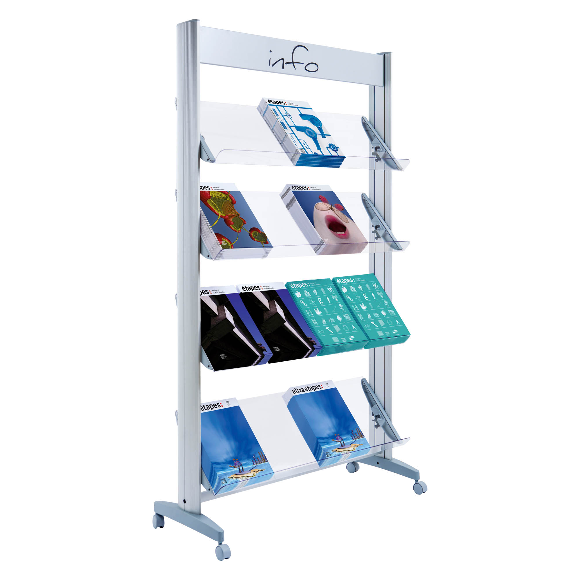Poner a disposición y llevar de vista todos sus libros y revistas exponiéndolos en este expositor móvil de una estructura de metal aluminio.