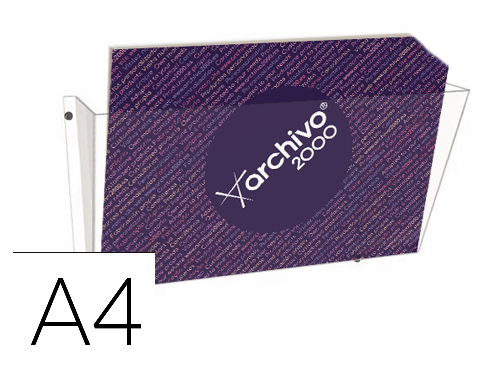 Portafolletos mural Archivo 2000 con 1 compartimento A4 horizontal. Fabricado en poliestireno ultra transparente de máxima calidad, muy resistente y estable. Fondo de cajetín de 40 mm. Incluye agujeros preperforados para sujeción en la superficie. Opción de formar combinaciones a tu medida. Incluye kit de fijación. Color cristal transparente. Medidas exteriores: 75x370x180 mm. Fabricado en España.