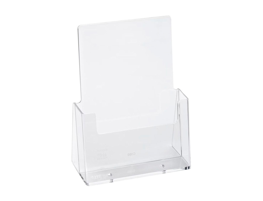 Portafolletos de sobremesa Archivo 2000 A4 vertical. Fabricado en poliestireno transparente muy resistente y estable. Fondo de cajetín de 38 mm y hendidura frontal que permite una manipulación rápida y cómoda del contenido. Amplia base que asegura estabilidad incluso en zonas de uso intensivo. Perfecto para oficinas, hoteles, restaurantes, recepciones y entornos comerciales donde se valora la claridad en la presentación del material informativo. Color cristal transparente. Color cristal transparente. Medidas exteriores: 125X220X290 mm. Fabricado en España.