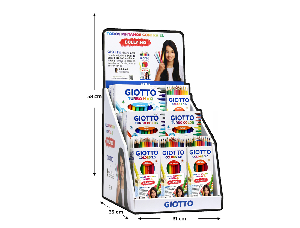 Expositor de cartón de mesa Giotto contra el Bullying. En esta Campaña 2024 Giotto destina 0,10 euros del estuche de 12 lápices de colores Giotto Colors 3.0 (cód. F276600) con packaging promocional o estándar, a favor del Plan de Sensibilización y Prevención contra el Bullying, dirigido a todos los alumnos de las escuelas de España, que ha creado junto a la Asociación Española para la Prevención del Acoso Escolar (A.E.P.A.E.). Descubre todo el Proyecto en www.todospintamoscontraelbullying.com .