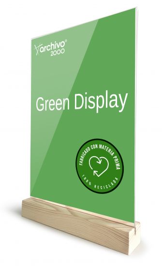 Expositor de sobremesa sostenible Green Display con base de madera. Visibilidad en las 2 caras.