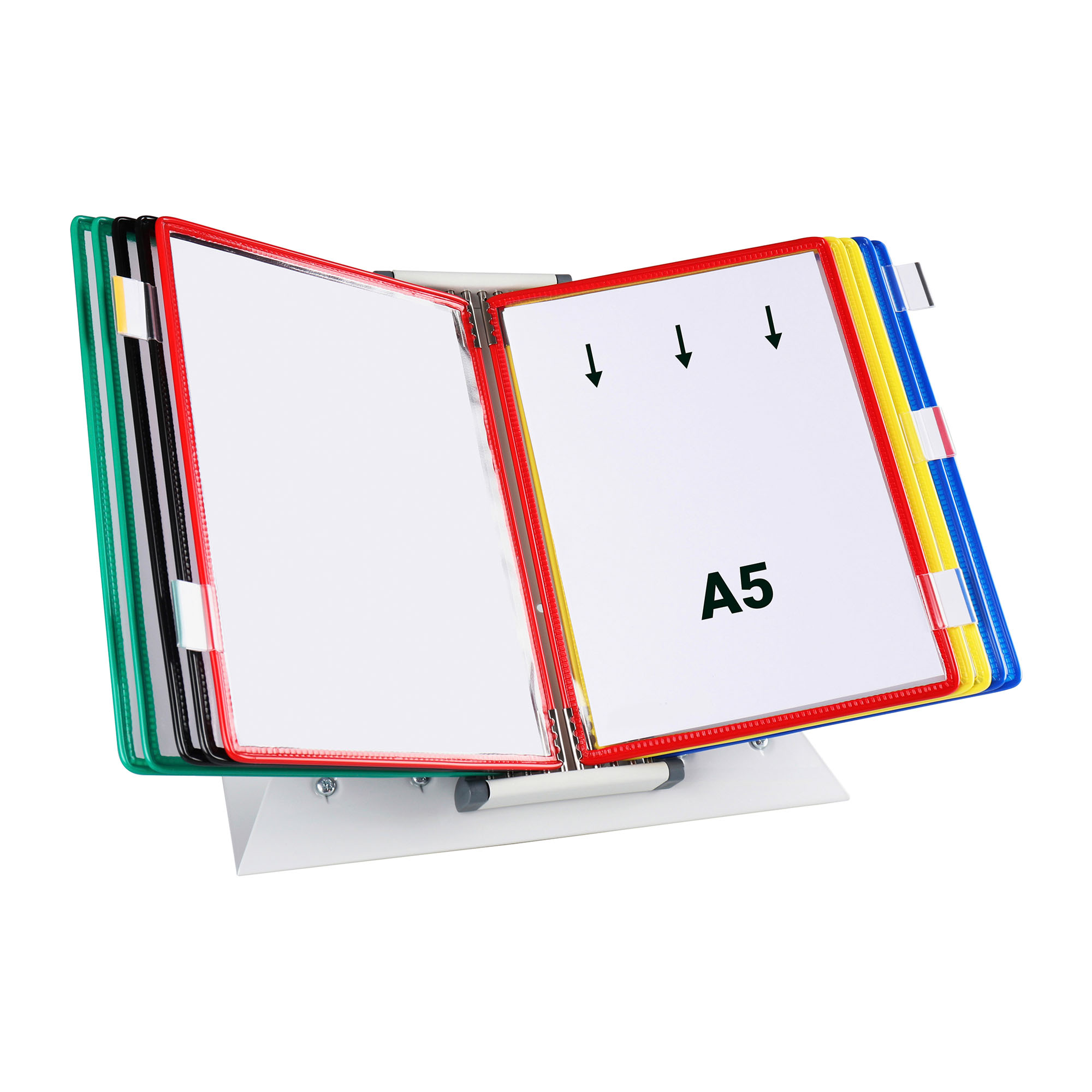 Expositor de mesa metálico con topes laterales y 10 fundas pivotantes A5.