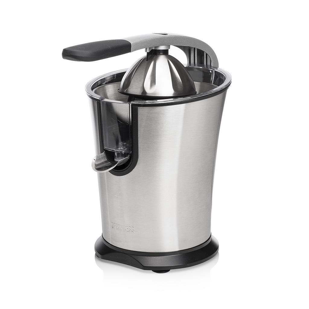 Exprimidor de cítricos Princess Master, cono universal, filtro para pulpa, depósito con sistema antigoteo, manual de instrucciones.