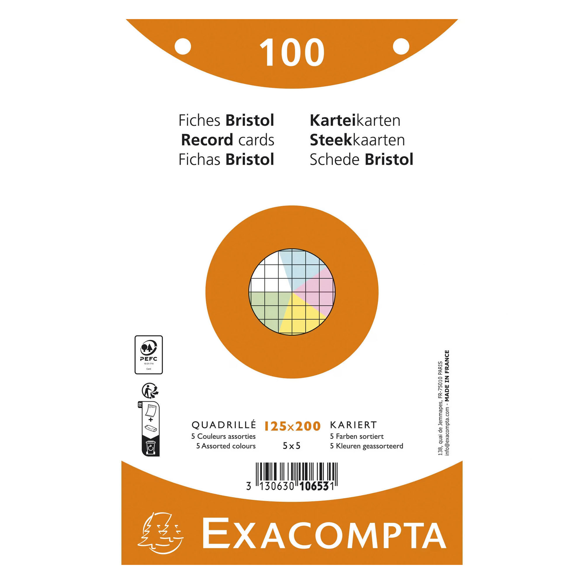 Ficha Bristol 125 x 200 mm cuadriculada 5 x 5 colores surtidos perforada Exacompta - Caja de 100