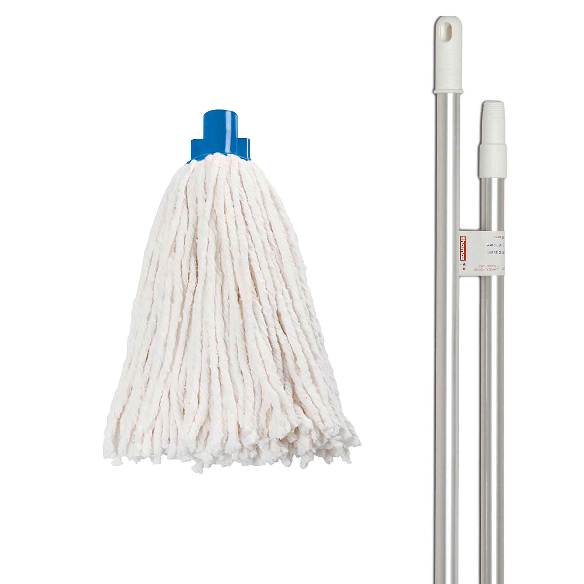 Fregona de hilo largo de algodón blanco con cabezal azul.