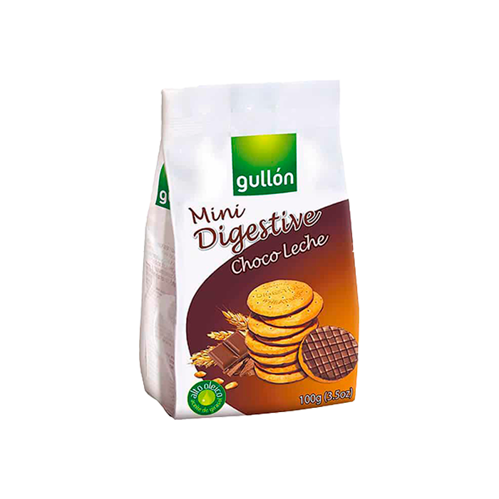 Descripción detalladaGalletas Mini Choco Digestive 100g, exquisitas galletas hechas con aceite de girasol alto oleico, de la marca Gullon.Paquete de galletas de Gullón de 100 gramos.Caja de 12 unidades.Alérgenos: Contiene Lactosa y gluten.