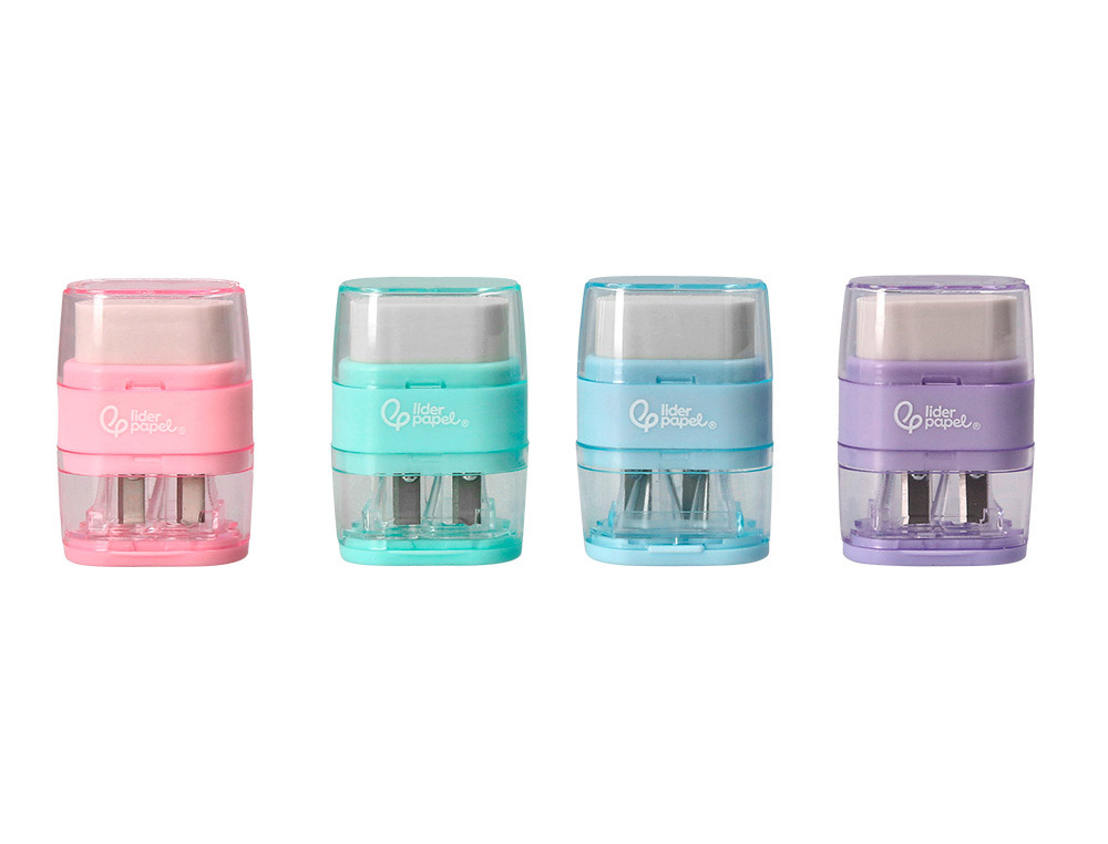 Añade un toque de color y funcionalidad a tu estuche con la goma de borrarrectangular Liderpapel, que incluye un práctico sacapuntas. Disponible en una variedad de colores pasteles: rosa, morado, azul y verde, perfectos p ara darle vida a tus tareas diarias. Diseño ergonómico 2 en 1: goma de borrar libres de ftalatos y sacapuntas integrados con dos orificios para afilar lápices de diferentes tamaños, seguros para niños. Incluye depósito. Facilita la limpieza y cuenta con protector de plástico. Colores pasteles: rosa, morado, azul y verde. Expositor de 12 unidades.