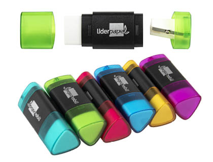 Descripción detalladaSacapuntas de plástico con depósito y goma de borrar triangular. Colores surtidos: azul, fucsia, lila, naranja, turquesa y verde. Goma ecológica sin pvc. Un uso.