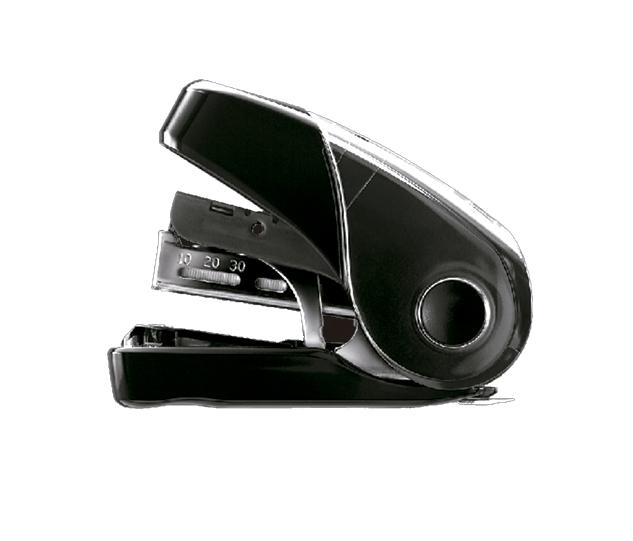 Grapa sin esfuerzo. Capacidad: 32 hojas. Capacidad de grapas: 50 más otras 100 extra en la parte superior. Utiliza grapas del número 10. Extraegrapas trasero. Alta tecnología en formato mini. Grapado plano