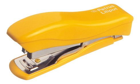 Grapadora de tamaño mini con cuerpo metálico y carcasa de plástico.