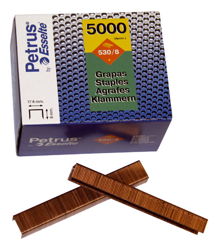 Descripción detalladaGrapas cobreadas 530/8, fabricadas con alambre de alta calidad. No se oxidan. Caja de 5000 grapas.