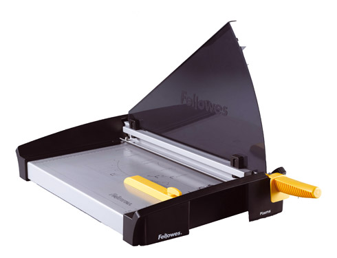 Guillotina Fellowes Plasma A3. Guillotina de palanca de gran capacidad. Corte hasta 40 hojas. Cuchilla de corte de acero inoxidable y contracuchilla. Protector de seguridad de cuchilla pre-ensamblado y plegable, para poder almacenar la guillotina con facilidad sin tener que quitar el protector. Base metálica con guías grabadas de formatos de papel, fotos y radios para el corte en ángulo.