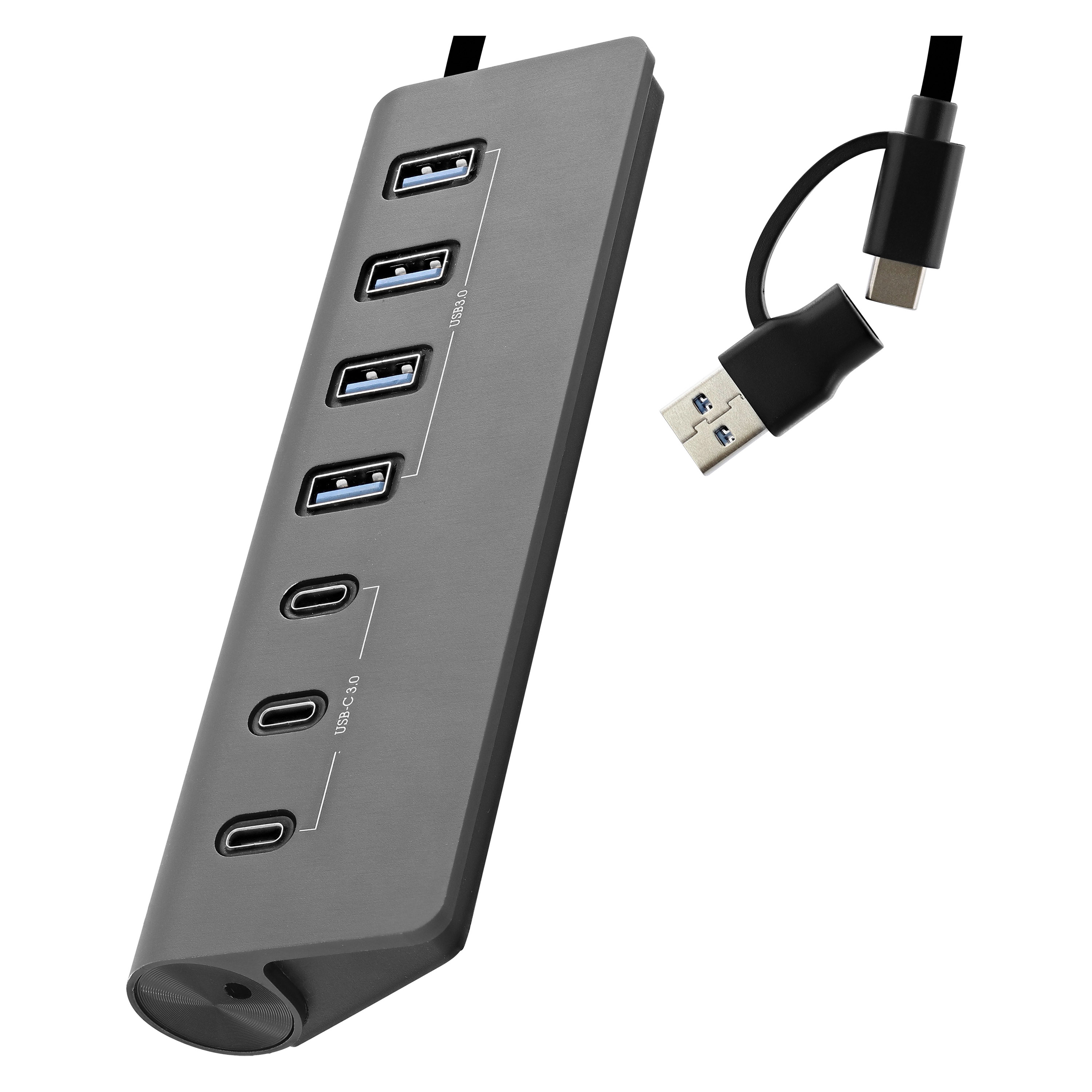 Conecte hasta 4 accesorios USB-A y 3 accesorios USB-C simultáneamente con este concentrador. USB 3.0 para una velocidad de transferencia de 5 Gbps. Compatible con puertos USB-A y USB-C gracias a su cable de doble conector integrado. Sólido y elegante gracias a su acabado en aluminio.