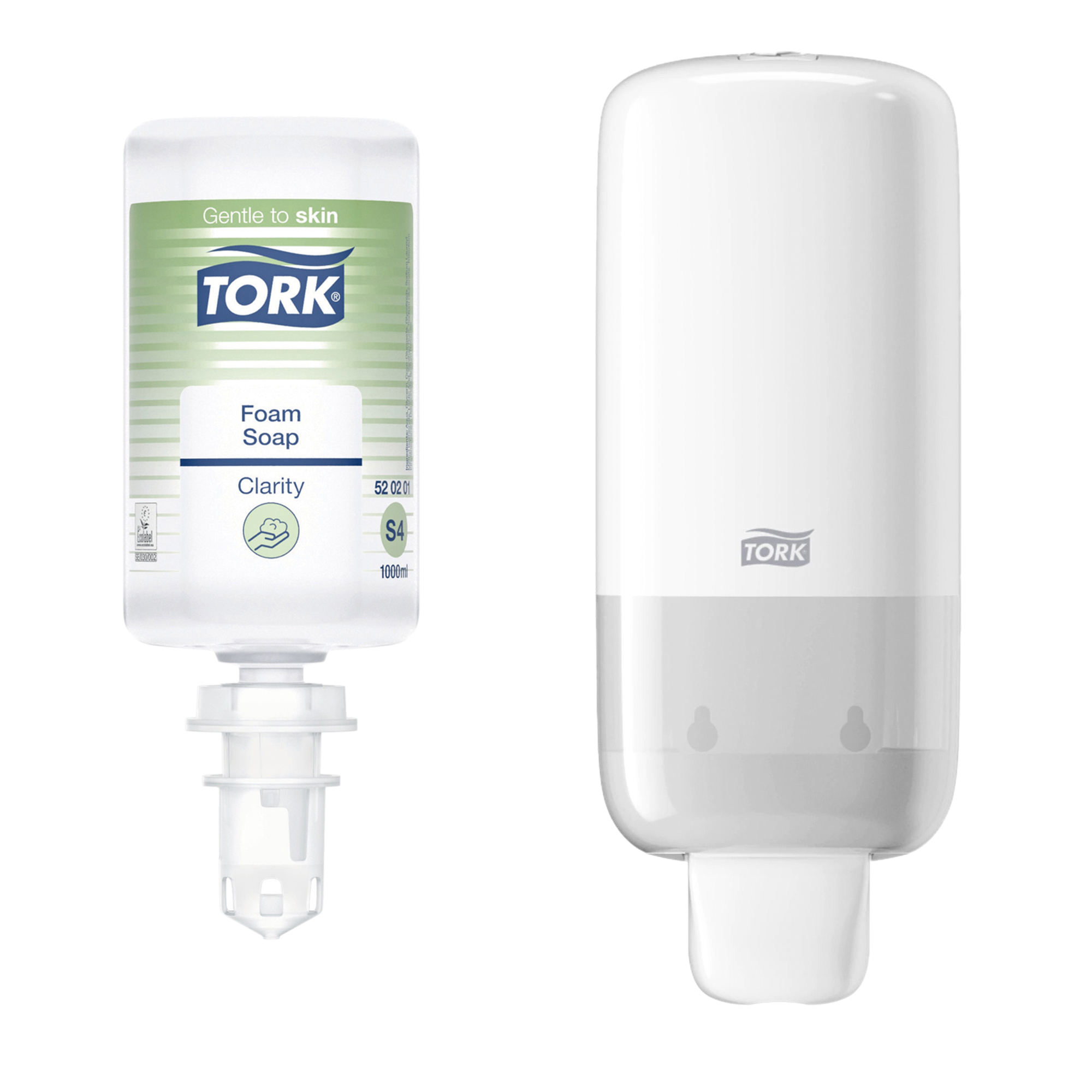 Dispensador Tork S4 GRATIS por la compra de 6 recargas : adecuado para aseos de cualquier tamaño y puede utilizarse con una gran variedad de productos para el cuidado de la piel de Tork que vienen en envases cerrados. Es fácil de utilizar y proporciona una higiene excelente. Los dispensadores de la línea Elevation tienen un diseño moderno y funcional con botón para dosificar el jabón.