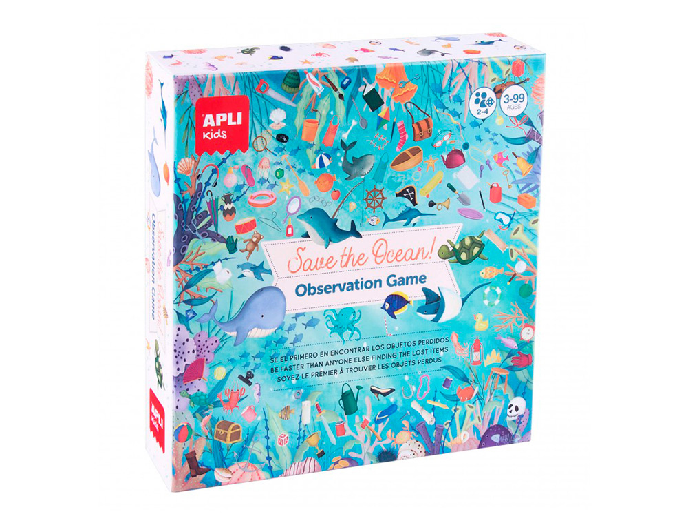 Juego de observación y velocidad Salvar el Océano. Los jugadores tendrán que encontrar lo más rápido posible las 4 imágenes de su carta en el tablero para ganar. El juego incluye cartas con imágenes de objetos que representan la basura que podemos encontrar en el océano y también los animales y plantas que viven bajo el agua, por lo que los niños a la vez que juegan aprenderán a sensibilizarse sobre el medio ambiente. El juego incluye: 1 tablero de 40 x 40 cm. 50 cartas con imágenes de 6,5 x 8,5 cm. 24 stickers reutilizables. 1 hoja de instrucciones. ¡Se el primero en encontrar los obj