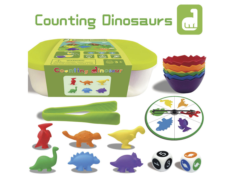 Set de 6 tipos de dinosaurios en diferentes colores. Dinosaurios fabricados en elastómero termoplástico. Vasos, pinza y caja fabricados en polipropileno. Los pequeños disfrutarán jugando con estos dinosaurios y aprenderána seleccionar por la especie, contar y clasificar. 72 Mini dinosaurios en varios colores. Tarjetas de actividad y ruleta. 6 Vasos, 2 dados, 1 pinza y 1 caja de plástico.